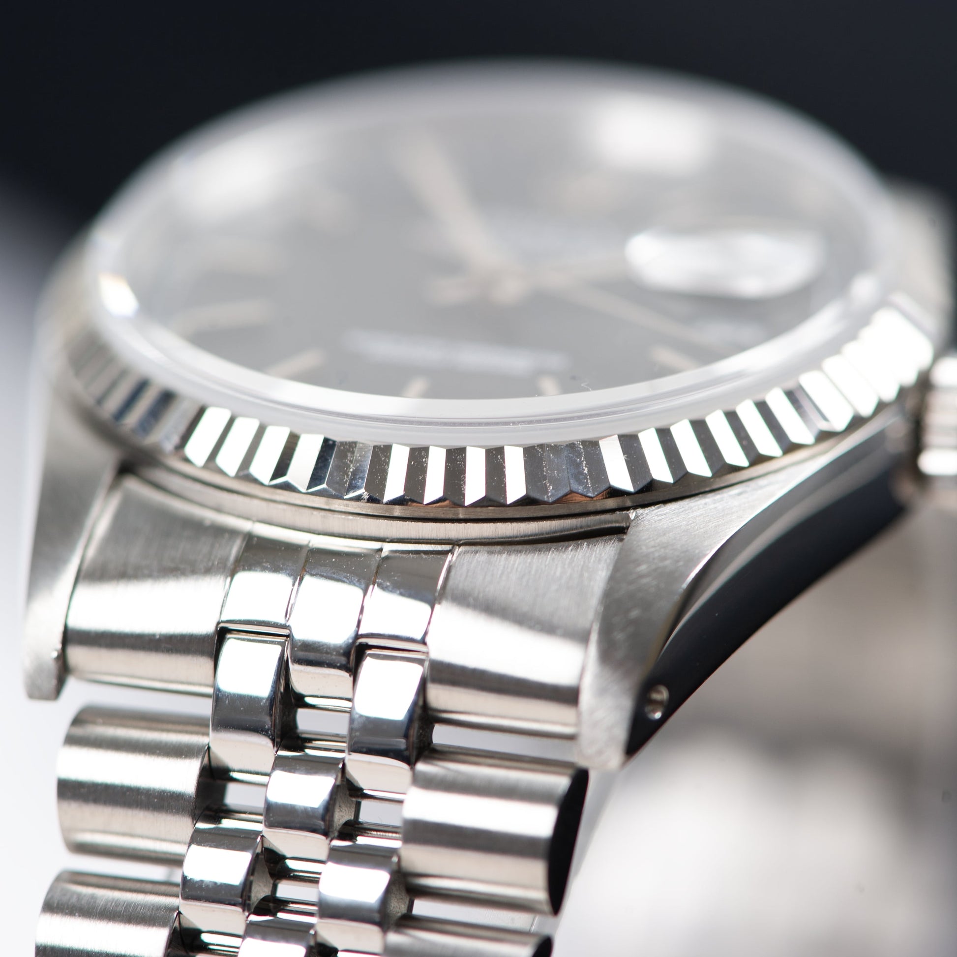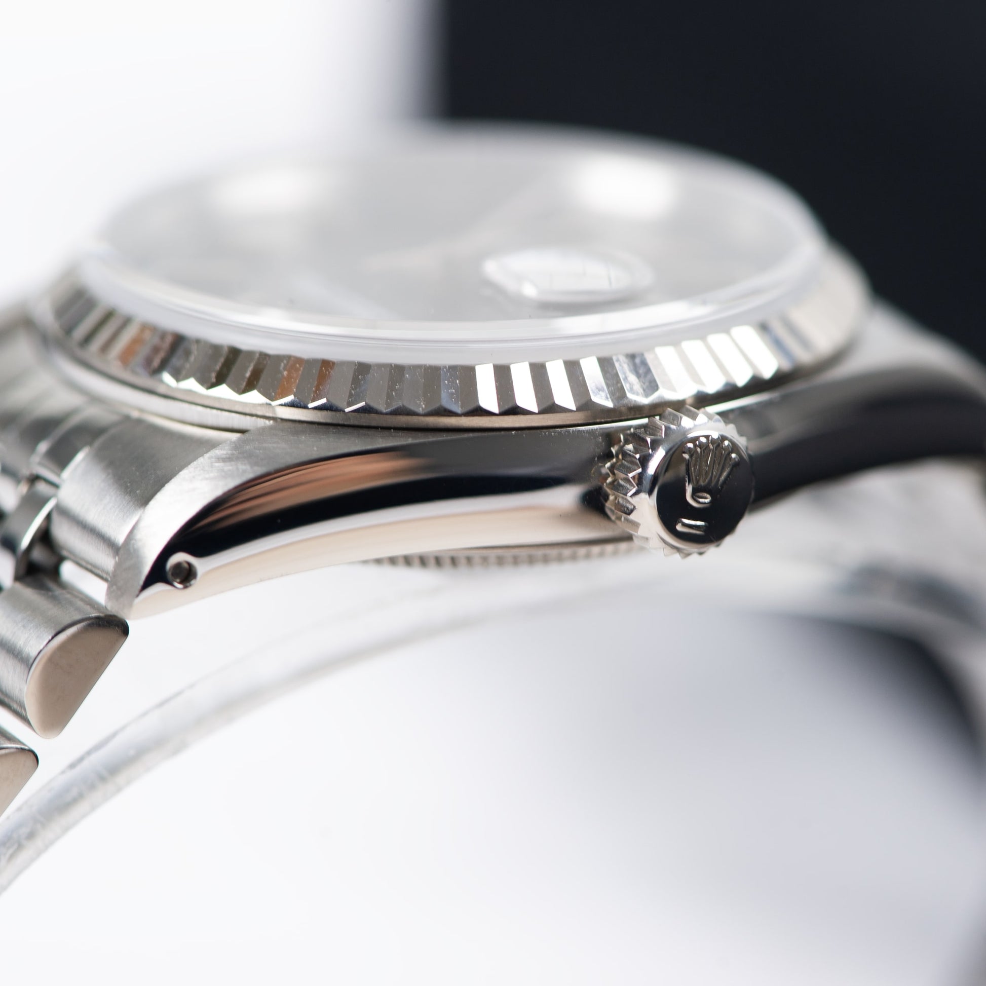 Original 'Rolex Oyster Perpetual Datejust 16234 Black Stardust Dial' from the year 1991. First released in 1945, the Rolex Datejust is obviously unmissable when you think of Rolex. The beautiful Jubilee bracelet, with the 18K White gold fluted bezel, which this watch is known for, gives this watch a stunning look. This watch is executed with a beautiful Original Rolex Black dial that, due to a manufacturing error in the lacquer of the dial, has corroded over the years, giving it a beautiful matte finish that resembles the star hemisphere. Among collectors, this specimen is also called the Stardust dial. On the dial is written the famous Text “Rolex Oyster Perpetual Datejust Superlative Chronometer Officially certified" and the T swiss made T Printing which leads off to the use of tritium in the original 18K white gold hands and around the hour markers. This Rolex Datejust 16234 has the 3135 automatic movement with a quickset date function and sapphire crystal.