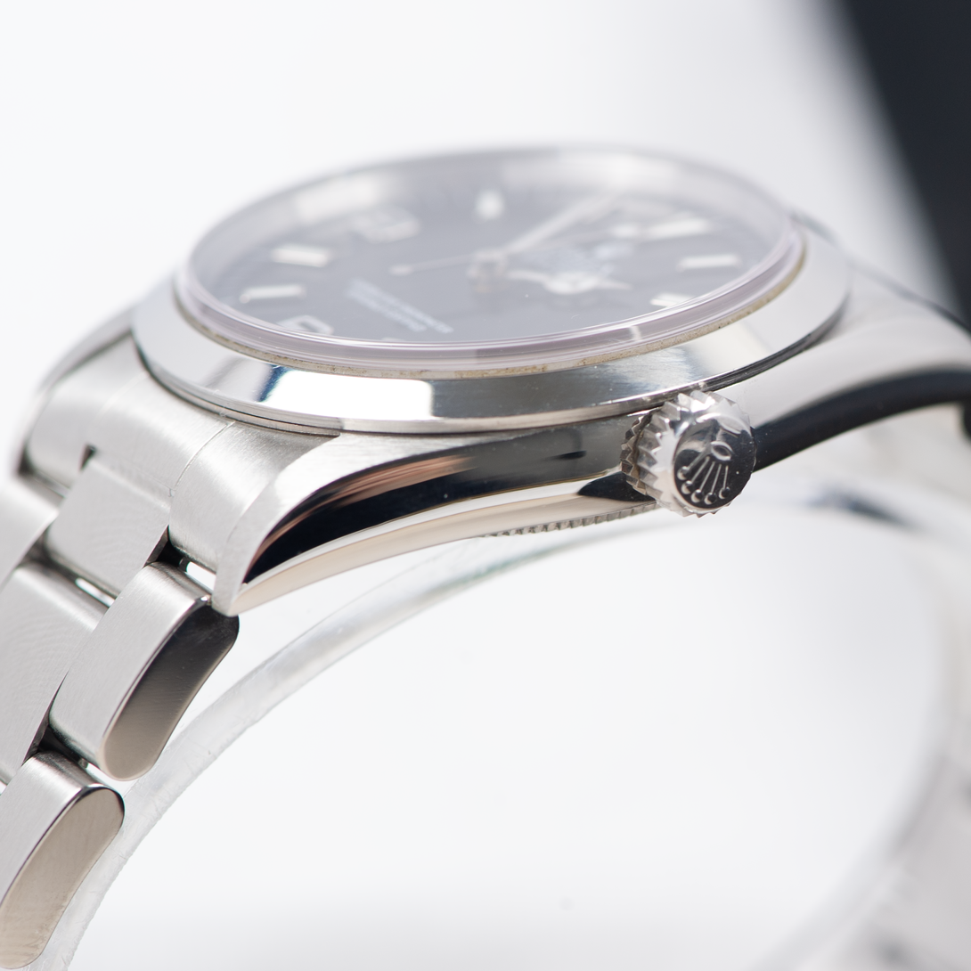 Original Rolex Oyster Perpetual Explorer 14270 Black Dial from 1999. First introduced in 1953, the Rolex Explorer is one of the most iconic models in the Rolex collection. Known for its simple yet rugged design, the 3-6-9 dial makes this watch an ideal companion for adventurers and professionals alike. Whether scaling Mount Everest or attending a business meeting, the Explorer is versatile and reliable.