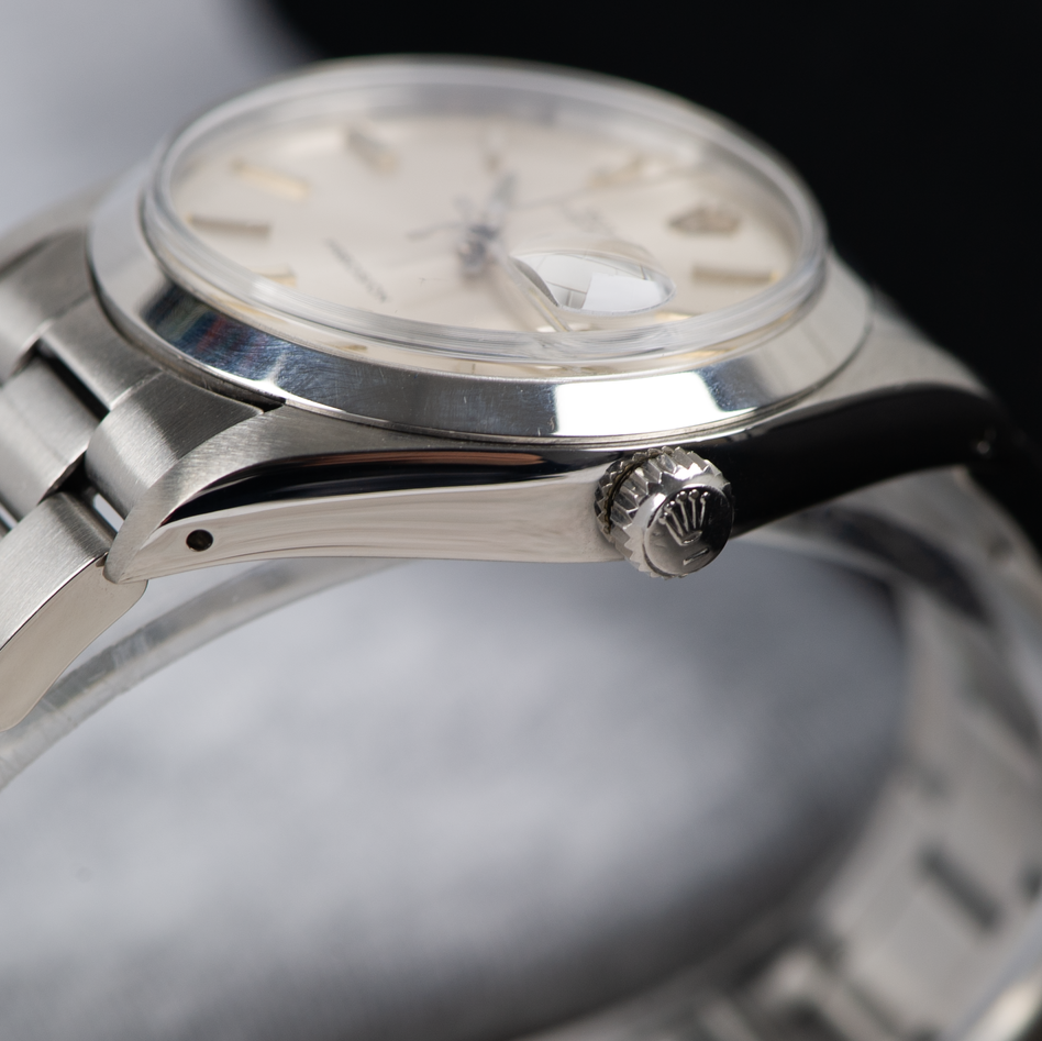 Rolex released the first Oysterdate Precision in 1953; this watch is an icon when you think of Rolex. Production of the 6694 ran from the late 1950s to 1987. The movement of the 6694 involves a hand-winding movement, which gives this watch a lot of character. In my opinion, the 6694 is a very charming watch with a lot of character and is also definitely underrated. As mentioned, this watch dates from 1978 and has a serial number 5xxxx. This precision 6694 features a 1225 hand-winding movement, acrylic crystal and has a silver dial with the original tritium hour markers and hands. The Rolex 6694 comes in stainless steel. The watch is in very good condition and has had service if needed.
